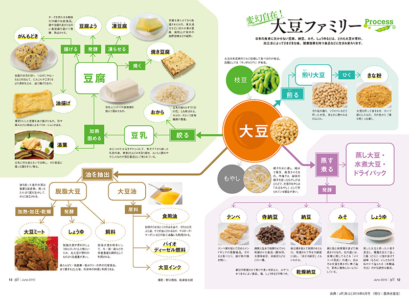大豆は加工法によって、さまざまな味、健康効果を持つ食品などに生まれ変わります。
