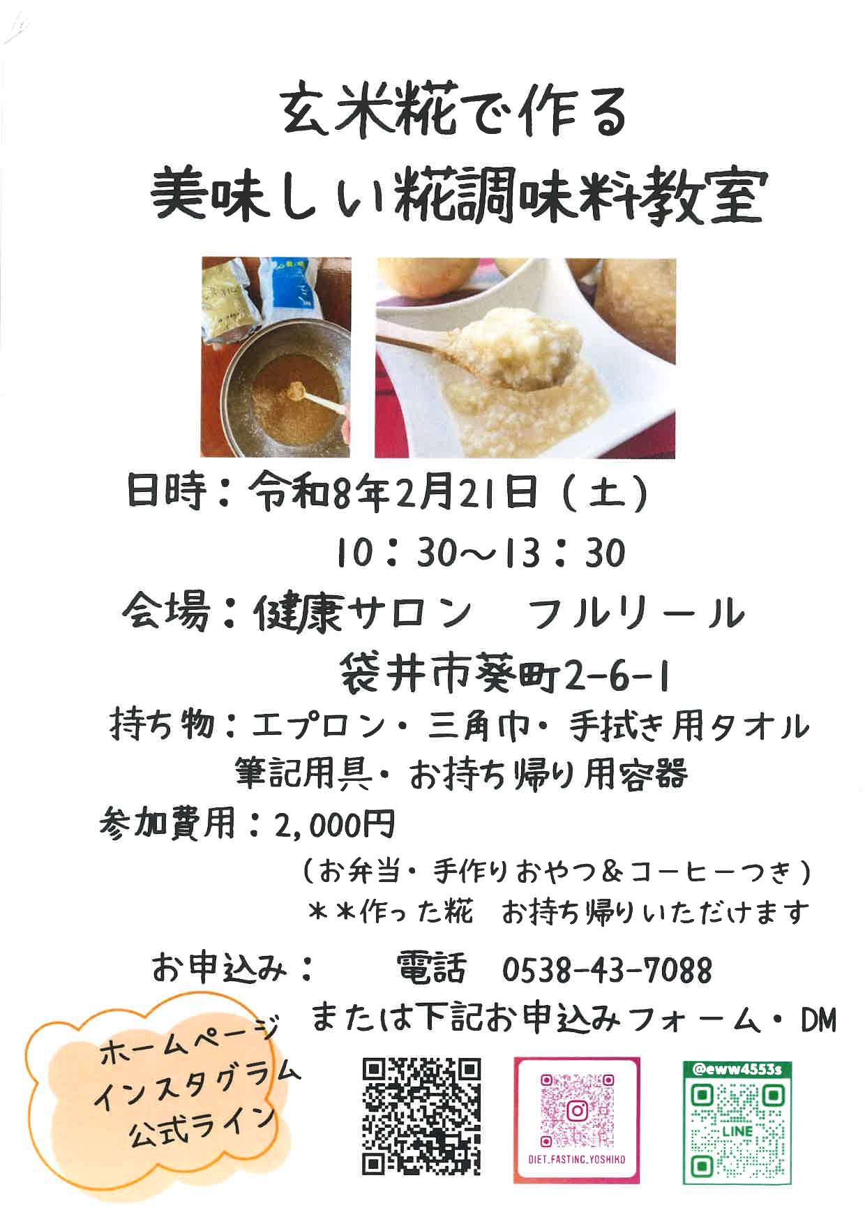 静岡県袋井市で健活中の皆様、お世話になります。サイト訪問有難うございます。袋井市の健康サロン フルリールです。令和8年2月21日(土)当サロンにて玄米糀で作る美味しい調味料教室が開催されます。