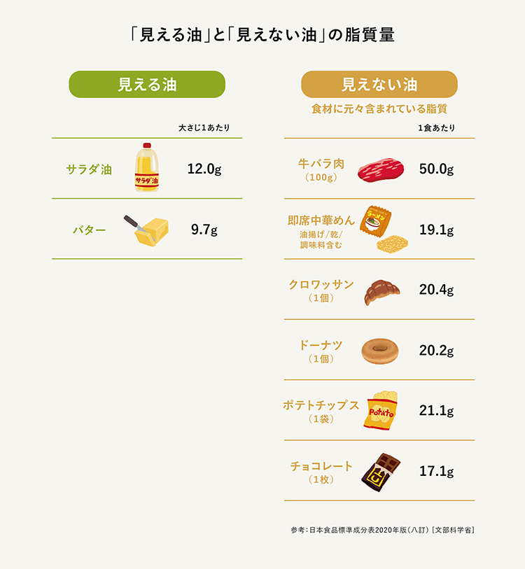 普段の食生活でも「見える油脂」を気にしがちですが、実は、脂質の摂取量の約8割は「見えない油脂」です(※)。