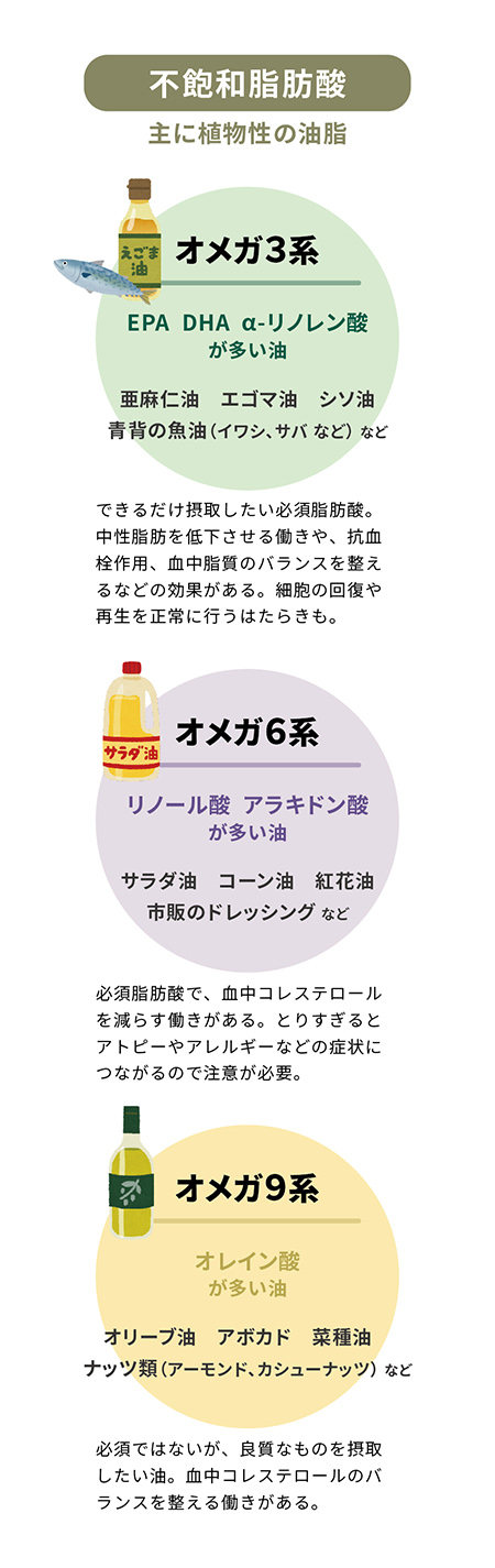 とくに不飽和脂肪酸には、血中脂質のバランスを整える作用をもつものもあるため、健康によいと注目されています。
